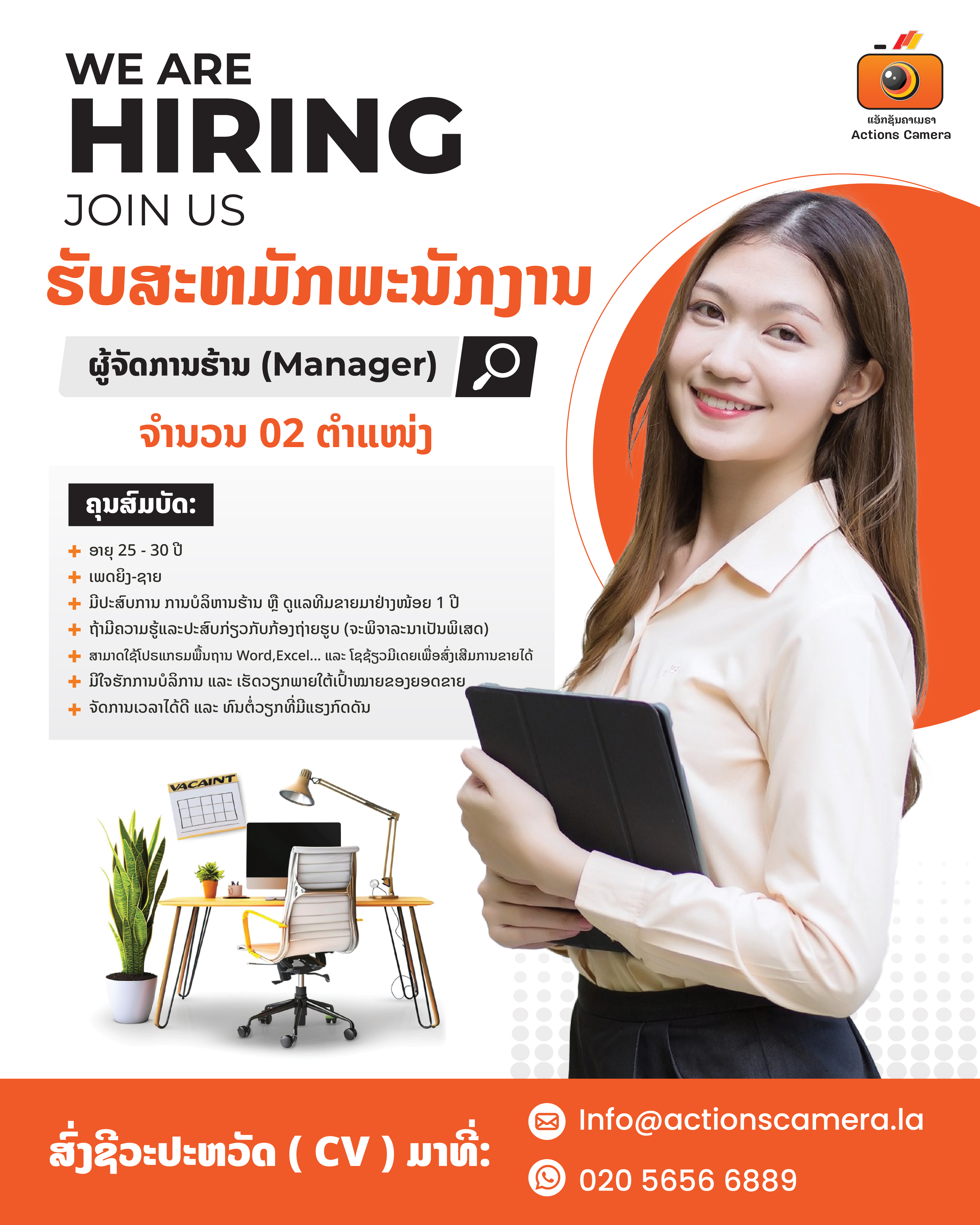 - ພະນັກງານ ຜູ້ຈັດການຮ້ານ (Manager) ຈຳນວນ 02 ຕໍ ເພີ່ມເຕີມ...