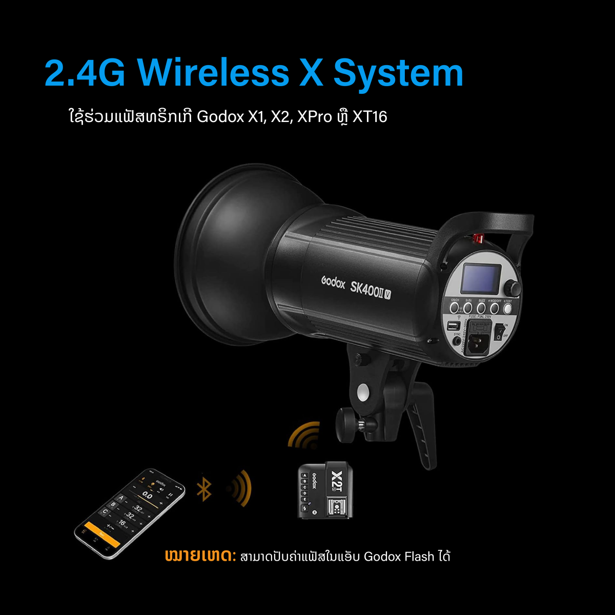 SK400II-V ມີລະບົບວິທະຍຸ X Series ທີ່ມີ 32 ຊ່ອງ, ເຮັດໃຫ້ການຄວບຄຸມຟັງຊັນໄຮ້ສາຍເປັນໄປໄດ້ດ້ວຍການຊື້ເຄື່ອງສົ່ງສັນຍານ X2T ຫຼື XPro ແຍກຕ່າງຫາກ. ຫົວຍັງມີຟັງຊັນຕ້ານການ pre-flash ທີ່ເຮັດໃຫ້ມັນງ່າຍທີ່ຈະເຮັດວຽກກັບຈຸດແລະຫນໍ່ໄມ້ສ່ວນຫຼາຍແລະກ້ອງຖ່າຍຮູບອື່ນໆທີ່ນໍາໃຊ້ pre-flash. SK400II-V ມີນໍ້າໜັກ 2.1 ກິໂລ, ຊຸກຍູ້ການປະກອບຊຸດທີ່ມີຫົວສອງ ຫຼືຫຼາຍກວ່ານັ້ນ ໂດຍບໍ່ຕ້ອງໃສ່ກະເປົາໜັກ.