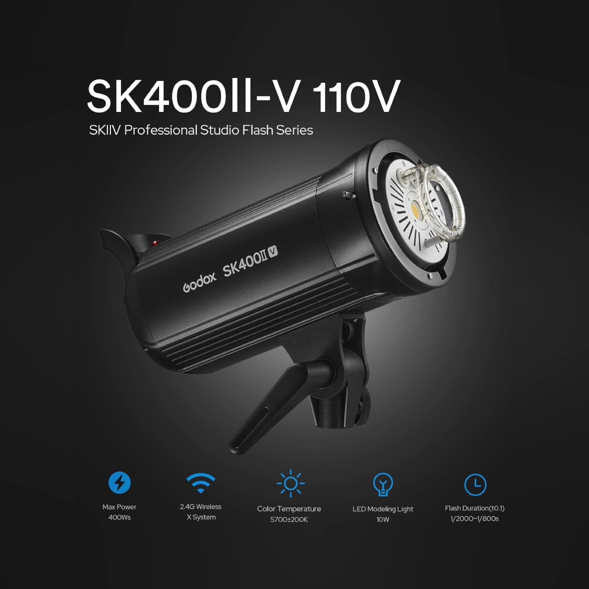 SK400II-V ມີອຸປະກອນເສີມດ້ານຫນ້າຂອງ Bowens, ໃຫ້ມັນໃຊ້ຕົວດັດແປງ Godox ເຊັ່ນດຽວກັນກັບອຸປະກອນເສີມຈາກຜູ້ຜະລິດຈໍານວນຫຼາຍທີ່ໃຊ້ລະບົບນີ້. ຫົວມີຂາຕັ້ງແບບອຽງ ແລະແລ່ນດ້ວຍພະລັງງານໄຟຟ້າ AC.